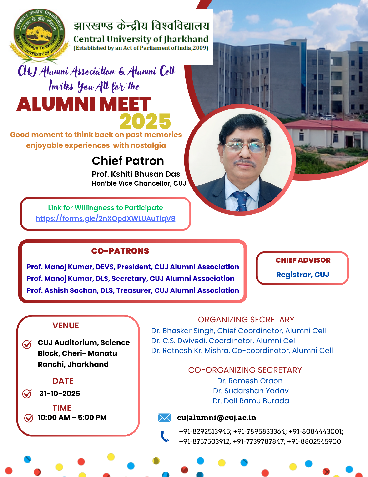 The President of India gave assent to The Central Universities Act, 2009 that envisages establishing and incorporating universities for teaching and research in the various states. The Central University of Jharkhand came into being under this Act on 1st of March, 2009. The tor of the Central University of Jharkhand, Her Excellency, Shrimati Pratibha Devisingh Patil, appointed Dr. Darlando T. Khathing, an internationally renowned scientist and a distinguished academic administrator, as its first Vice Chancellor. CUJ’s focus will be on research in cutting-edge technologies.