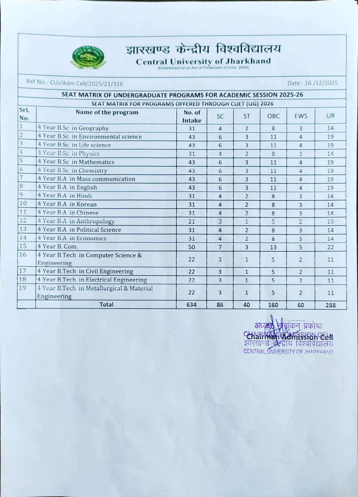 Seat matrix for UG Program