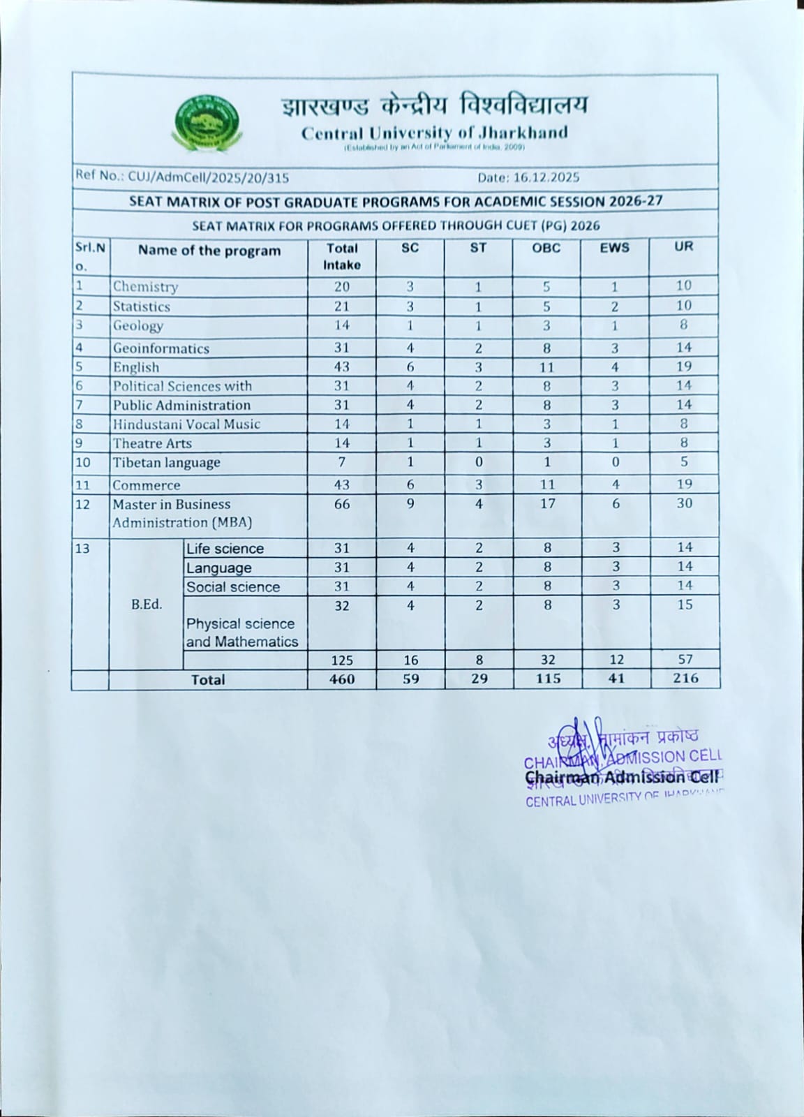 Seat matrix for PG program