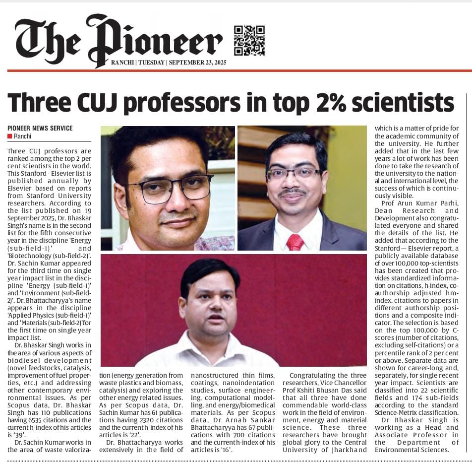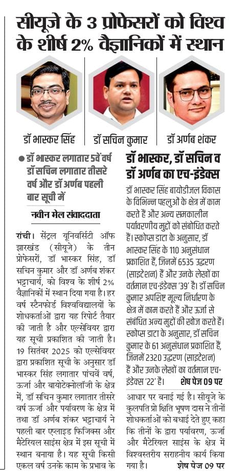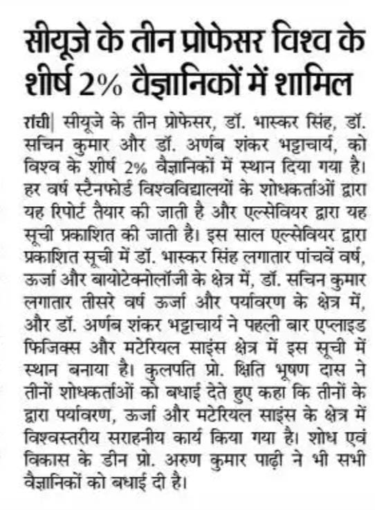 CUJ Scientists in Jharkhand Ranked Among World’s Top in Energy, Environment, and Materials