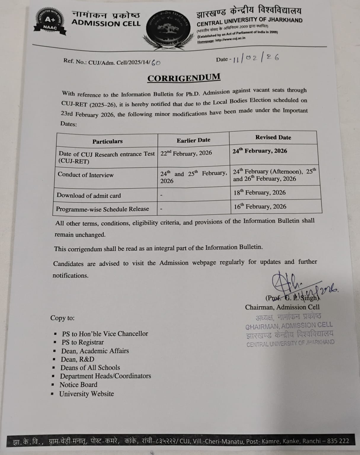 Corrigendum - CUJ-RET (2025-26) - Revised Date