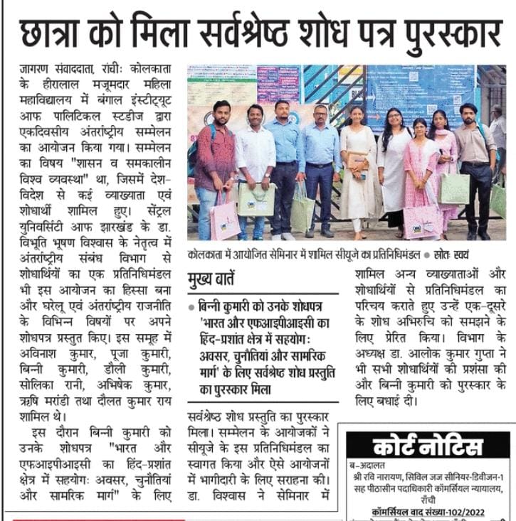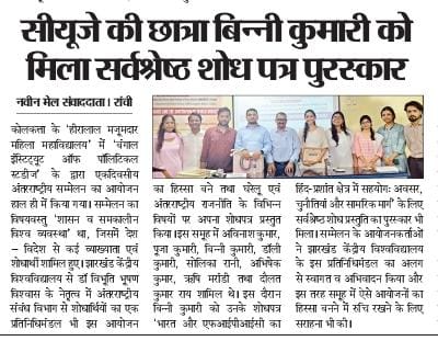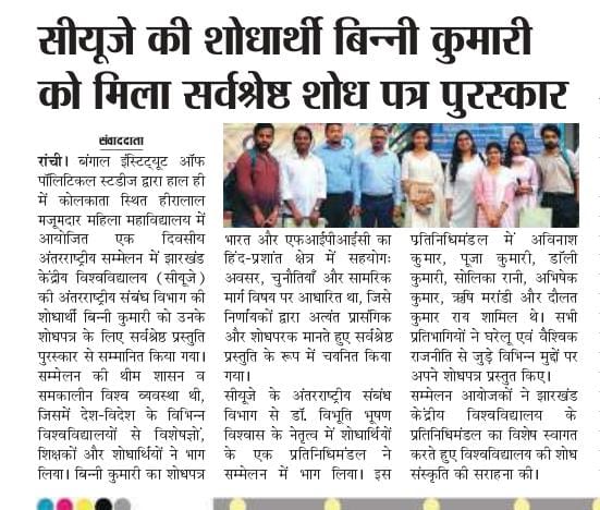 सीयूजे की छात्रा बिन्नी को कोलकाता में अंतर्राष्ट्रीय सम्मेलन में मिला सर्वश्रेष्ठ शोध पत्र पुरस्कार