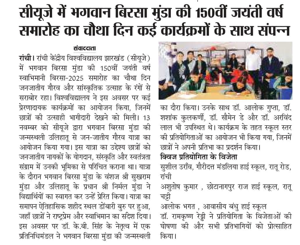 CUJ में भगवान बिरसा मुंडा की 150वीं जयंती वर्ष के उपलक्ष्य में विविध कार्यक्रमों का आयोजन